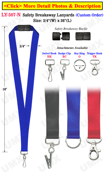 The 3/4" corporate safety ID lanyards come with breakaway safety protection. There are 14 colors with 4 hardware attachments to choose from. We provide factory direct bulk low price to general public with fast turnaround time.