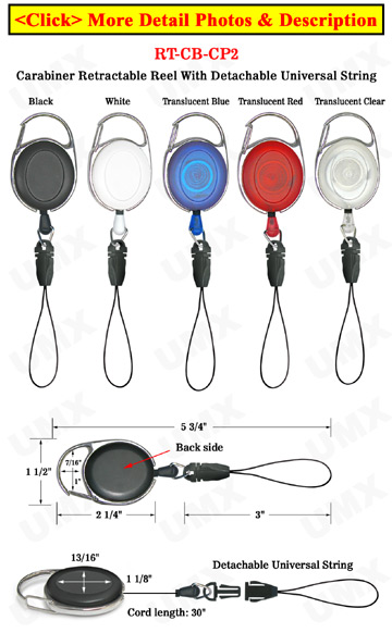 The RT-CB-CP2, retractable carabiner comes with a detachable universal cell phone style fastener string. The detachable function allows you to easily remove attached items without having to remove the entire retractable from your belt loop, pocket or purse. This product, along with the cell phone hardware attachment, is great for small items such as identification cards, badges, handheld devices, USB memory drives, and name tags.
