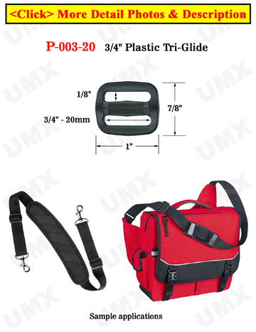 P-003-20, plastic strap connectors, tri-glides come with 1" outside diameter and 3/4" inside diameter. It is a great designed strap buckles for adjusting strap length. It is great for apparel, leashes, backpacks and crafts making.